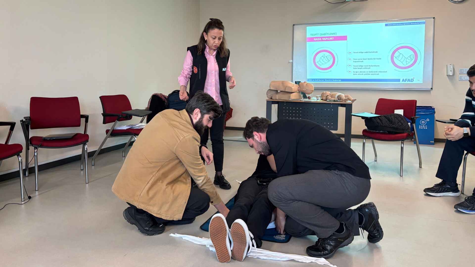 Üniversitemiz mensuplarına yönelik afetlere karşı daha bilinçli, hazırlıklı ve donanımlı bireyler yetiştirmek amacıyla AFAD iş birliğiyle yürütülen Destek AFAD Gönüllüsü eğitim programı, 01 Aralık 2025 Pazartesi günü gerçekleştirilen “İlk Yardım Eğitimi”yle başladı.
