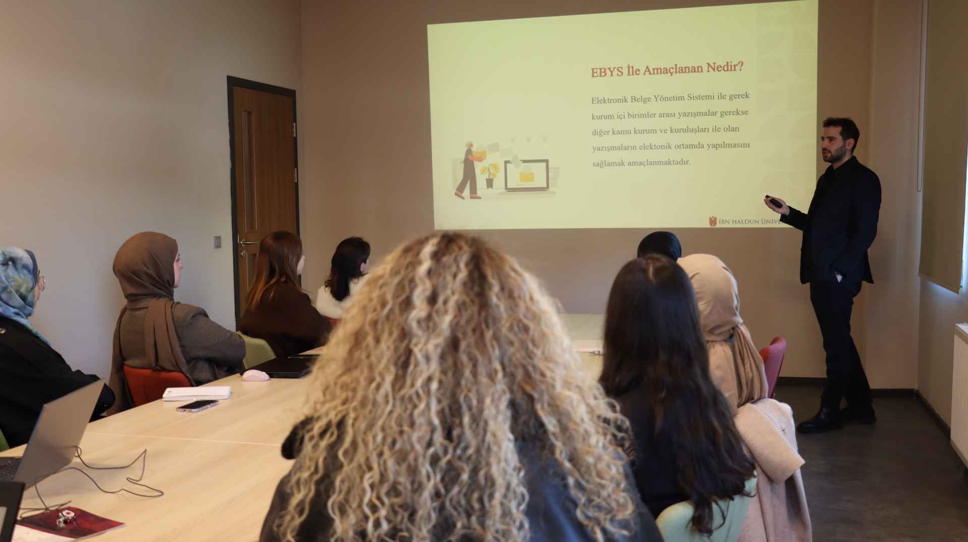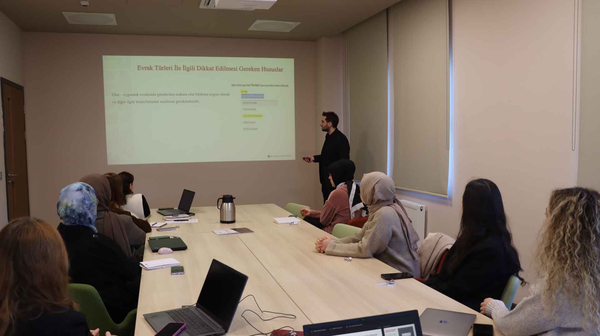 Eğitimde, resmî yazışmaların doğru ve standartlara uygun olarak nasıl yapılması gerektiği ele alındı. Ayrıca katılımcılara dijital ortamda belge yönetimi konusunda temel bilgiler sunularak yazışma kuralları, sistemin etkili kullanımına dair pratik ipuçları ve iş süreçlerinin hızlandırılmasına yönelik stratejiler paylaşıldı.