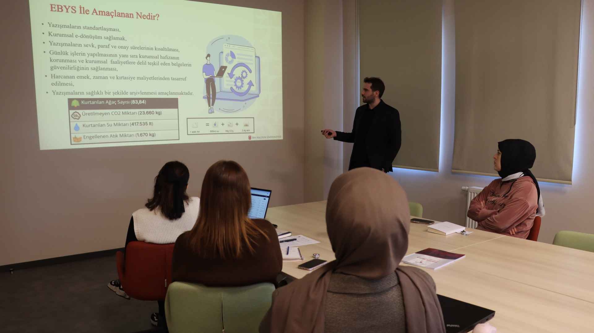 Üniversitemiz hizmet içi eğitim çalışmaları kapsamında Yazı İşleri Müdürlüğünde görevli Bilgehan KARAHAN tarafından yeni başlayan idari çalışanlarımıza yönelik olarak 13 Ocak Salı günü Rektörlük binası Z.49 numaralı salonda Resmî Yazışma Kuralları ve EBYS Eğitimi verildi.